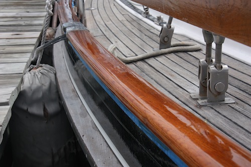I just added 2 more coats of Pettit Flagship Varnish over our exterior teak caprail, eyebrow & grabrails with 5 steps: