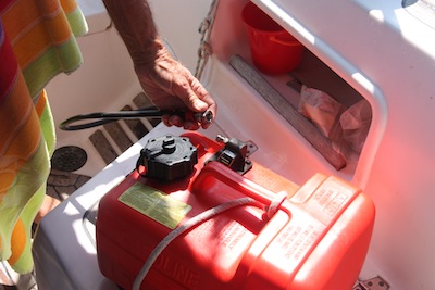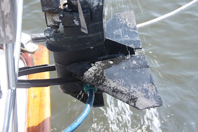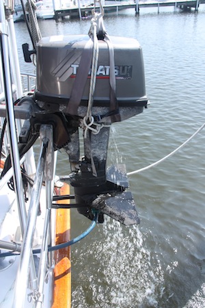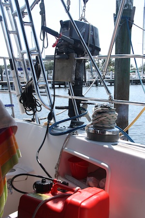 Now why would we want to fresh water flush our trusty Tohatsu outboard? I dunno, David got this idea almost 15 years ago that flushing all the salt out of the outboard before leaving it for an extended period sitting on the rail would make it last longer. When we returned to Burnt Store Marina, we noticed that all the fishermen were routinely fresh water flushing their outboards after being in the salt water. Hmmm… if it’s good enough for them, maybe we’ve been doing something right all these years. Regardless, our trusty Tohatsu 8 hp 2 stroke is now 12 years old and going strong. We’ve had to replace the bracket holding it to the transom of the dinghy, tune it up and routine maintenance, but nothing major.