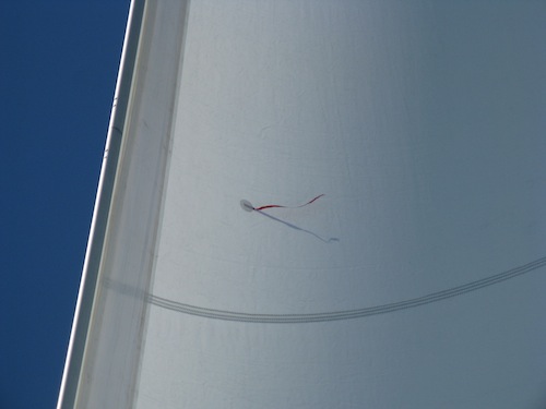 Most cruising boats, ours included, don’t have telltales on the leech (back edge) of the mainsail. Actually we had them, but over the years they’ve fallen off & we haven’t replaced them. But if you do have them, they could be streaming aft or sometimes stalling out as you’re sailing to windward. Off the wind on a reach, the mainsail leech telltales should be flowing aft, if not the sail needs to be adjusted either out or in until they stream aft.