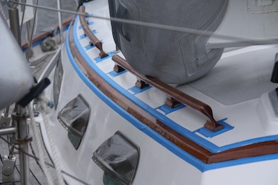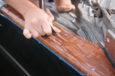 We use Pettit Flagship Varnish – not inexpensive, but after all the required prep work, blue taping, wet sanding (i.e. hard manual labor!), it seems silly to skimp on the actual varnish.