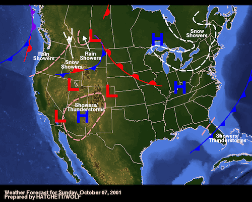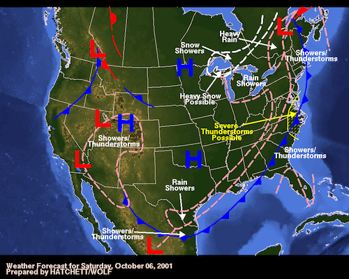 Here’s NOAA’s surface analysis from October 6, 2001 — the day before we were departing, showing the lousy weather. The next day, see surface analysis below October 6, you can see the storms cleared out & there was nothing that looked scary in this surface analysis. So we left Cape Fear Inlet.