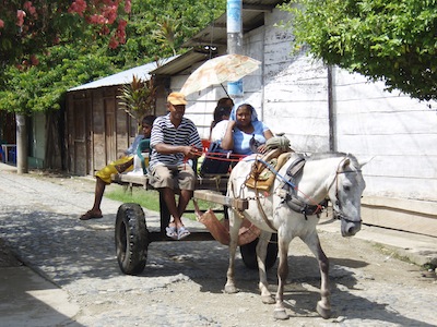 After exploring the tiny village of Sapzurro – all two main “streets” – no cars or carts, we took our dinghys around the mountain point to the somewhat larger “resort” town of Capurgana. Capurgana is a lively, friendly juxtaposition of old and new Colombia. There are no cars, only donkey carts … a “taxi” is a delightful old man gently guiding his donkey cart. The cart is a flatbed wooden affair with 4 colorful plastic chairs, legs cut off, screwed to the cart. To take the taxi, you simply jump into one of the plastic chairs swinging your legs from the side of the cart! Makes it easy to jump off too!