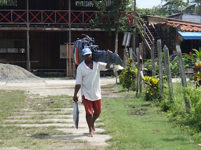 Because it’s a border town – apparently a couple years ago there was a bloody guerilla confrontation here – the Policia National greeted us as we tied our dinghys to the cement dock. Everywhere there were Marines, busily at work building something just out of sight beyond the point of the bay.