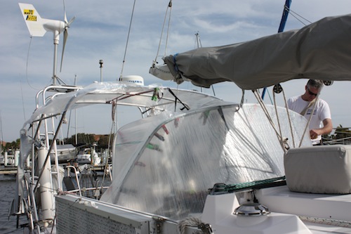 Fast forward 10 years and the Cadet Grey canvas needed replacing again. It leaked like a sieve and despite using all the 303 Fabric Protectant I had aboard before we left Panama, and then supplementing with Thompson’s Water Seal (a last resort) in Belize to get us back to the US, we decided to take the plunge and completely redesign our family room. After all, we spend most of our time aboard in the cockpit – eating, relaxing, reading, showering, everything but sleeping. So we formalized our wish list and invited three different canvas makers aboard to see our wish list and offer their opinions about about our options.