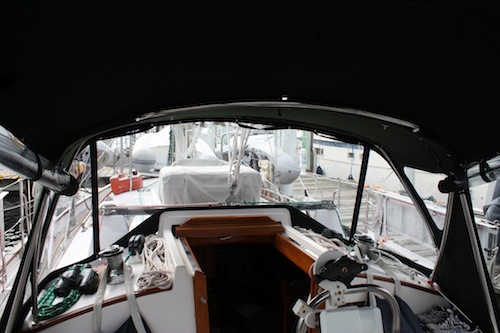 2. Boom, Winch & Other Necessary Access: If the end of your boom is over the dodger or bimini, make sure you have access to work on the end of the boom. Since we’re commuter cruisers, we take all the canvas including the Mack Pack and mainsail off at the end of each season and easy access to the end of the boom is a requirement. We also wanted the new enclosure to allow us to use our winch handles under the dodger – the old one didn’t have enough clearance. We even got alot more clearance on our side winches, although not 360 degree. Other cockpit details such as a space for the lines that connect the Monitor Windvane to the steering wheel were also painstakingly thought out. For this step, it’s important to sit in your cockpit with your canvas maker and think through in detail all the things you do in the cockpit while sailing as well as at anchor.