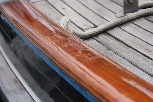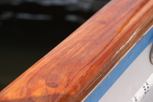 I just added 2 more coats of Pettit Flagship Varnish over our exterior teak caprail, eyebrow & grabrails with 5 steps: