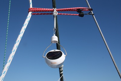 We hang ours from the bungee that keeps the halyards from slapping the mast during the day to get maximum sunlight. And transfer it to the cockpit at sunset. It’s possible it might get enough light in the sunlight hanging in the cockpit, and we’ll test that soon. It rotates so you can point the solar panel on top toward the sun.
