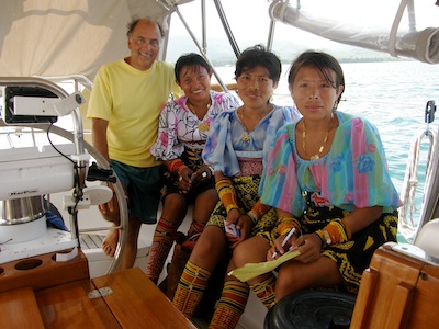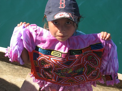 Here mola makers visit sailboats. The first day the visitors were a couple of wooden cayucos with kids – really CUTE kids, at that, with a few molas. And the kids speak Spanish as well as Kuna, so we can converse. The next day, immediately after coffee, David was working on our inverter fan, still plaguing us by refusing to shut off after the inverter is off … anyway, it was like a cloud of locusts descending! In the Kuna Congresso meeting last night, they must have decided that since we’d been anchored for two days and not been ashore, perhaps we weren’t coming ashore & they authorized all 3,000 people to sell us molas! At one point, we had two grandmothers, a five year old and her mother sitting in our cockpit looking through two huge feedsacks of molas. I happened to glance over at Kristiana (our buddy boat). Doug was entertaining one group of Kuna women on the foredeck, Rayene had another group in the cockpit looking at their molas and there were two more cayucos full of Kuna hovering around the boat waiting patiently for their turn. Rayene bought thirteen molas that day and I was lucky to only buy three!