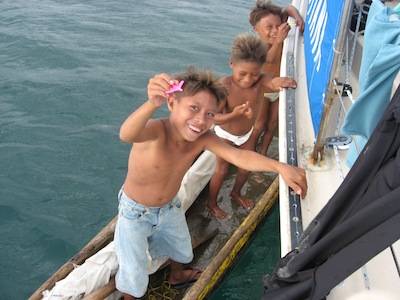 When we finally went ashore in Achutupu, we met a young man in an Indiana Pacers jersey! They asked us if we knew Reggie Miller! Small world! A dozen or so young boys were playing basketball on the town court and David joined in the fun to the delight of all. At first his airballs were unimpressive, but as he warmed to the action and began drilling jump shots, he was actually invited to join one of the teams the next day at 5 PM for their game! Afterwards, we bought fresh Kuna bread (breadsticks) – you know they’re fresh when you have to wait a few minutes for them to come out of the propane fueled oven. We stuff down a few to let them melt in our mouths while they’re still warm! Twenty breadsticks here cost $2.00 or 5 cents each, less than Anachucana!