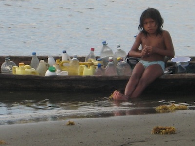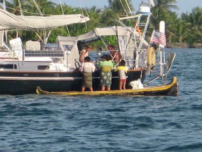 It was very interesting that the elder grandmother in our cockpit wanted any plastic bottle we had … even the coke bottles in the trash. At the time, we thought it was strange, but it turned out the water pipe to this village is broken. So until they get it repaired which apparently is not a village priority, all the women paddle a mile or so downwind to reach a freshwater creek coming out of the mountains to gather fresh water. Their cayucos are loaded every morning by 7 AM with anything they can use to carry fresh water, commonly eight 5 gallon buckets of water that these women paddle back upwind. Note that it’s only women hauling water. Men haul coconuts, plantains and firewood, but never water.