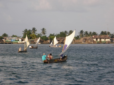 After the sand was hauled, the cayucos raced back to the village – and guess who is anchored RIGHT in the middle of their racecourse! You guessed it! Winterlude and Kristiana! Sailing upwind in a crude wooden cayuco doesn’t seem likely, but shortly they’re all close reaching, FLYING past us in a 15 knot breeze, whitecaps piling into their boats requiring constant bailing to stay afloat. Sometimes we worry that they won’t be able to make a course correction in time to keep from t-boning Winterlude, but they’re expert sailors from a early age! We see kids as young as 8 expertly handling these craft, and toting around their younger siblings – sometimes as young as 3! The variety of sails was astounding, mostly pieced together sheets of many colors, a few had “real” sails, albeit ancient. One was green and red, seemed appropriate for our Christmas season! A few craft had mains and jibs, but most were rigged similar to an opti, and some had a sunfish style sail rig. They’re all smiling and laughing, calling out to one another as they race. They smile and call out the traditional Kuna greeting “Nuedi” — pronounced “new-aa(longA)-dee” – as they fly by us. When they reach the lee of their island village, they drop the sails – lifting the wooden spars and then the mast out of the hole carved directly into the bottom of the cayuco and paddle the rest of the way.
