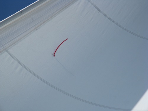 Most cruising boats, ours included, don’t have telltales on the leech (back edge) of the mainsail. Actually we had them, but over the years they’ve fallen off & we haven’t replaced them. But if you do have them, they could be streaming aft or sometimes stalling out as you’re sailing to windward. Off the wind on a reach, the mainsail leech telltales should be flowing aft, if not the sail needs to be adjusted either out or in until they stream aft.