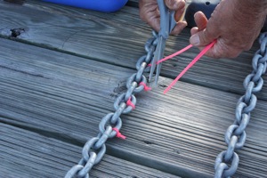 David puts the markers on the chain, using 4 for each color so hopefully while the chain is freewheeling, he’ll be able to see the different depths. Then he trims off the excess “tail”. We’ve done it both ways, leaving them on or cutting them off. The new markers David chose to cut off because the “tails” also wore off quickly, leaving extra pieces of plastic in the anchor locker.