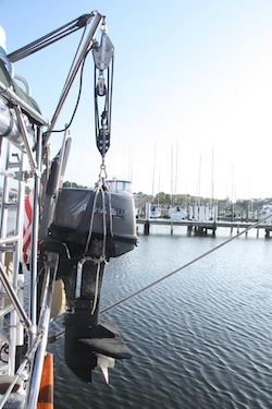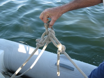 Obviously, it’s easy to tie the bowlines in different places to rebalance when the outboard is not on the dinghy for hanging.