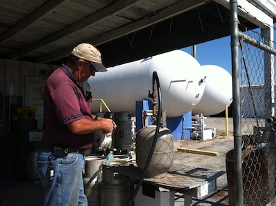 We had to drive all the way to the propane dealer in Ft Myers, FL for Amerigas to get the tank refilled. They were the only ones we knew that knew the law/regulations about horizontal propane tanks.