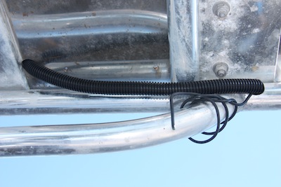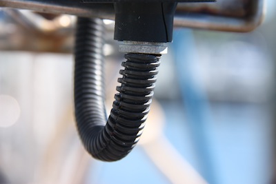 So David walks down the dock and Steve shows him Li-Ward’s bow light and the wiring cover. He even gives David enough to cover our bow light wiring. When we arrived back in Florida, we happened to see more of this stuff — apparently it’s called “Wire Loom” in Home Depot and bought some to finish covering all the rest of our exterior wiring – stern light, anchor light (that’s on our arch) and the wiring that comes through the platform from our KISS Wind Generator on its way into the arch.