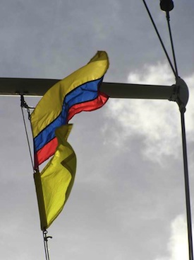 s/v Winterlude, anchored at Providencia flying our yellow quarantine flag & the Colombian courtesy flag, waiting for Mr Bush to come & check us in to Colombia, our first South American country!!!