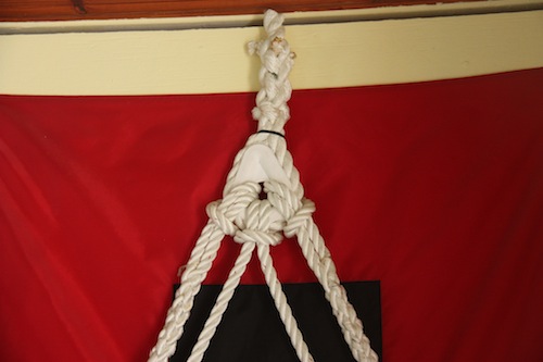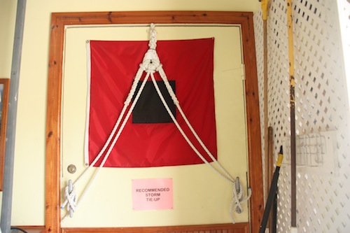Here at the Boot Key Harbor mooring field/City Marina, Marathon, Florida Keys, there’s a special flag to alert boaters when more preparation is necessary for an upcoming storm. On the wall at City Marina they have the flag and also an example of how they want the boat’s lines attached to the mooring.