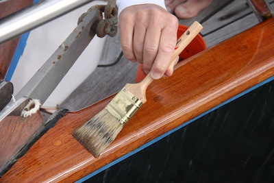 And of course, use only a good badger hair brush – otherwise, before you’re halfway down one side you’ll be losing bristles and there’s nothing more frustrating than trying to pick escaped bristles out of newly brushed varnish. Ask me how I know! After I’m done with the first coat, I clean the brush with turpentine and leave enough in a metal soup can (or any small can) to cover the brush until the next day. After we’re done with the project, I toss the brush if I’ve used it for two complete coats. It will do more, but it’s easier to start with a new brush next time. For small touchups such as you’ll see below, I often just keep some small cheapo foam brushes aboard and toss them after I use them.