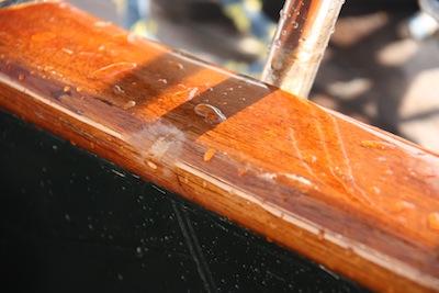 If you look very closely by the teak plug behind the brush, you can see where I’ve brushed new varnish on over the wetsanded previous coats. Don’t forget, brush one way only!