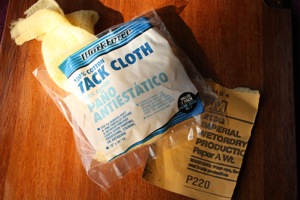 3. After the teak is dry and all the sanding goo is off, we use tack cloth to get the final residual dust off. Note the sandpaper here is 220 grit, this photo was from when we were originally doing the teak and going up through the grits of sandpaper from rough to extra-fine. We used 400 on the maintenance coats.