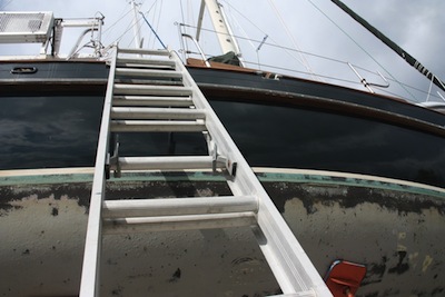 First of all, you’ll be climbing up and down that ladder multiple times daily! And I am convinced that a substantial number of accidents that happen in boatyards include falls from boarding ladders. So first of all, some ladder safety tips!