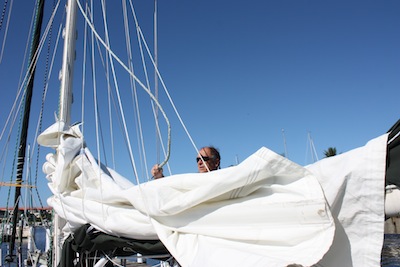 3. Dropping the main, we unattach the halyard and then move the lazy jacklines forward to the mast and out of the way. For this step we don’t care that it’s not flaked properly because we’re going to roll it. Because we can never believe weather predictions, we choose a nice calm day several days before we’re actually ready to leave the boat – and then roll the main, secure it with sail ties but leave it on the boom protected by the sail cover.